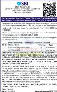 Advertisement for recruitment of Specialist cadre officers on Contract Basis vide advertisement number CRPD/SCO/2025-26/05 for the below mentioned posts was open for registration from 11.07.2025 to 07.08.2025.