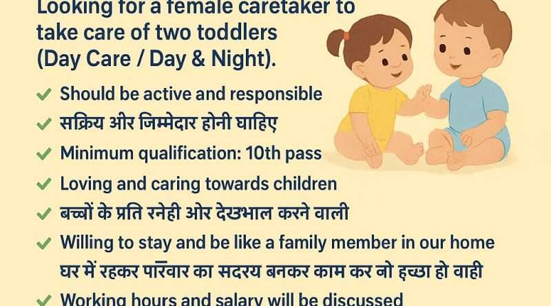 Read MoreRecruitment for Female Caretaker in Jammu URGENTLY REQUIRED तत्काल आवश्यकता FEMALE CARETAKER महिला देखभाल करने वाली Looking for a female