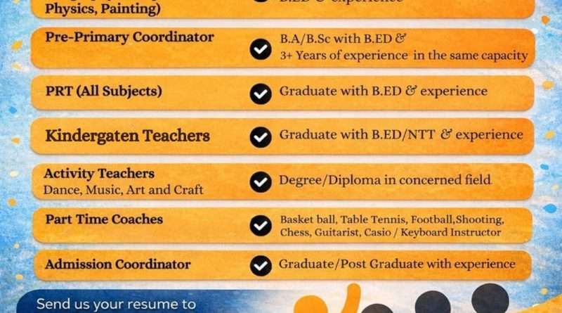 Read MoreRecruitment in Srijan International School, Jammu We’re Hiring! Vacancies Available PGT (Post Graduate Teachers)Subjects:English, History, Geography, Computer Science, Physics, PaintingQualification:Post