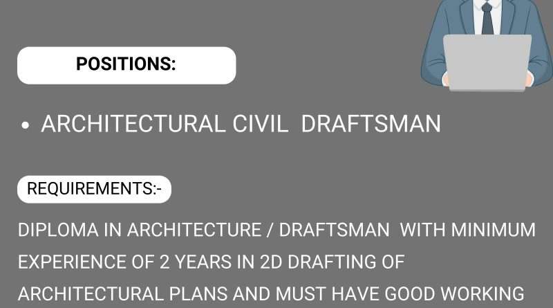 Read MoreArchitectural/Civil Draftsman Required in Jammu DRAFTSMAN — Hiring! Join our team Positions: Architectural / Civil Draftsman Office Location : Jammu