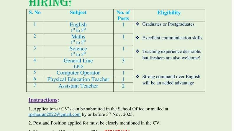 Read MoreJob Recruitment in Army Public School Damana WALK-IN-INTERVIEW A walk-in interview will be held on 30th October 2025 at 10:00