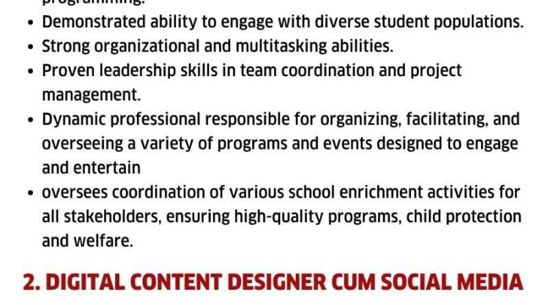 Read MoreJob Recruitment in SP Smart Schools 1. ACTIVITY COORDINATOR:-Bachelor’s degree in Education, Sport Management, Event Management, or related field (CELTA).Location: