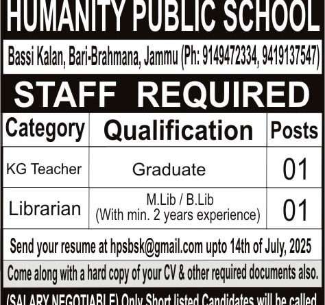 Read MoreHUMANITY PUBLIC SCHOOL JOBS Bassi Kalan, Bari-Brahmana, Jammu (Ph: 9149472334, 9419137547) STAFF REQUIRED Post : KG Teacher : Qualification :