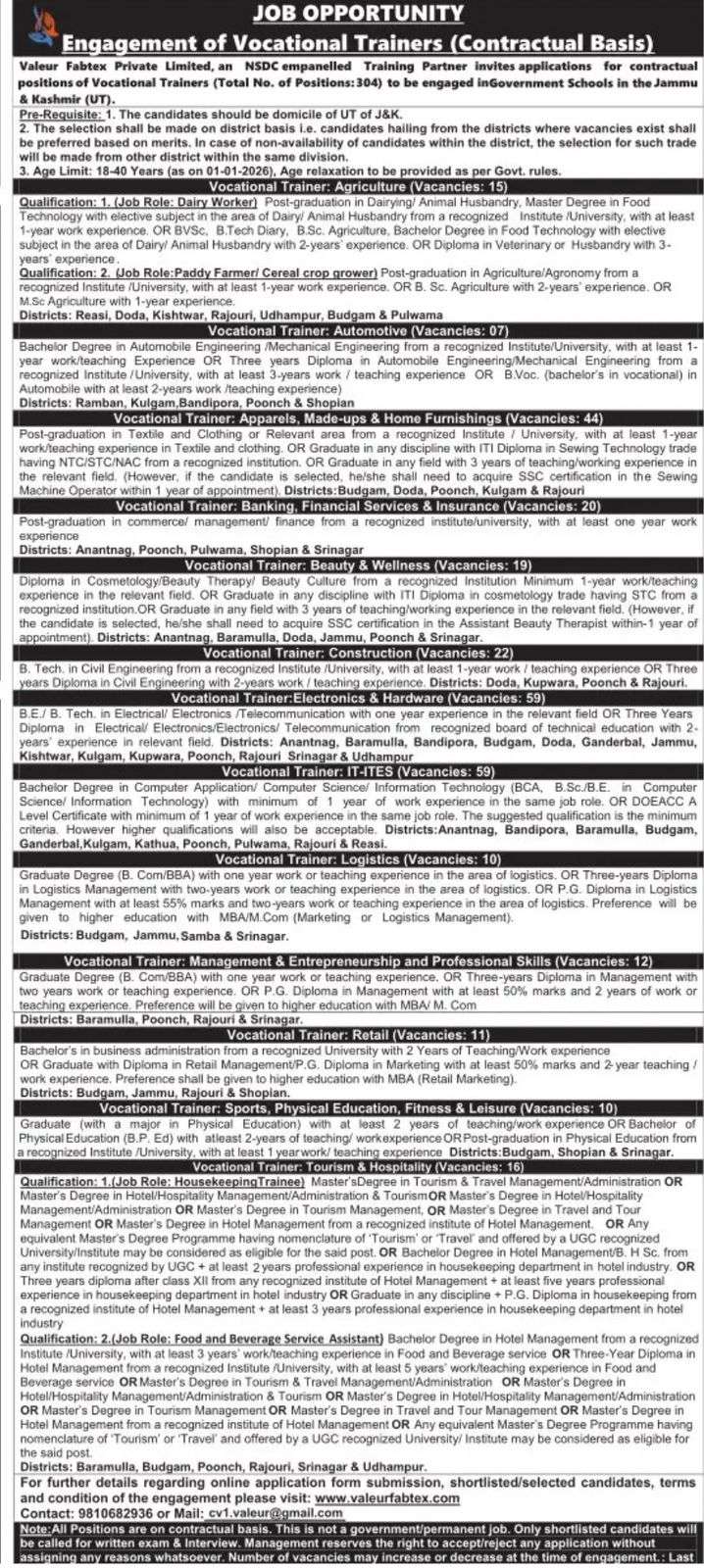 Valeur Fabtex Private Limited, an NSDC empanelled Training Partner, invites applications for contractual positions of Vocational Trainers (Total No. of Positions: 304) to be engaged in Government Schools in the Jammu & Kashmir (UT).