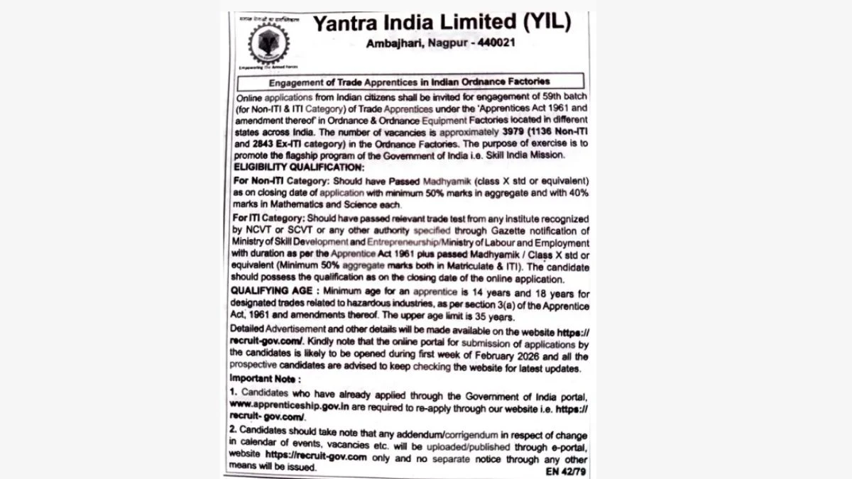 3979 Posts: Yantra India YIL Recruitment 2026
