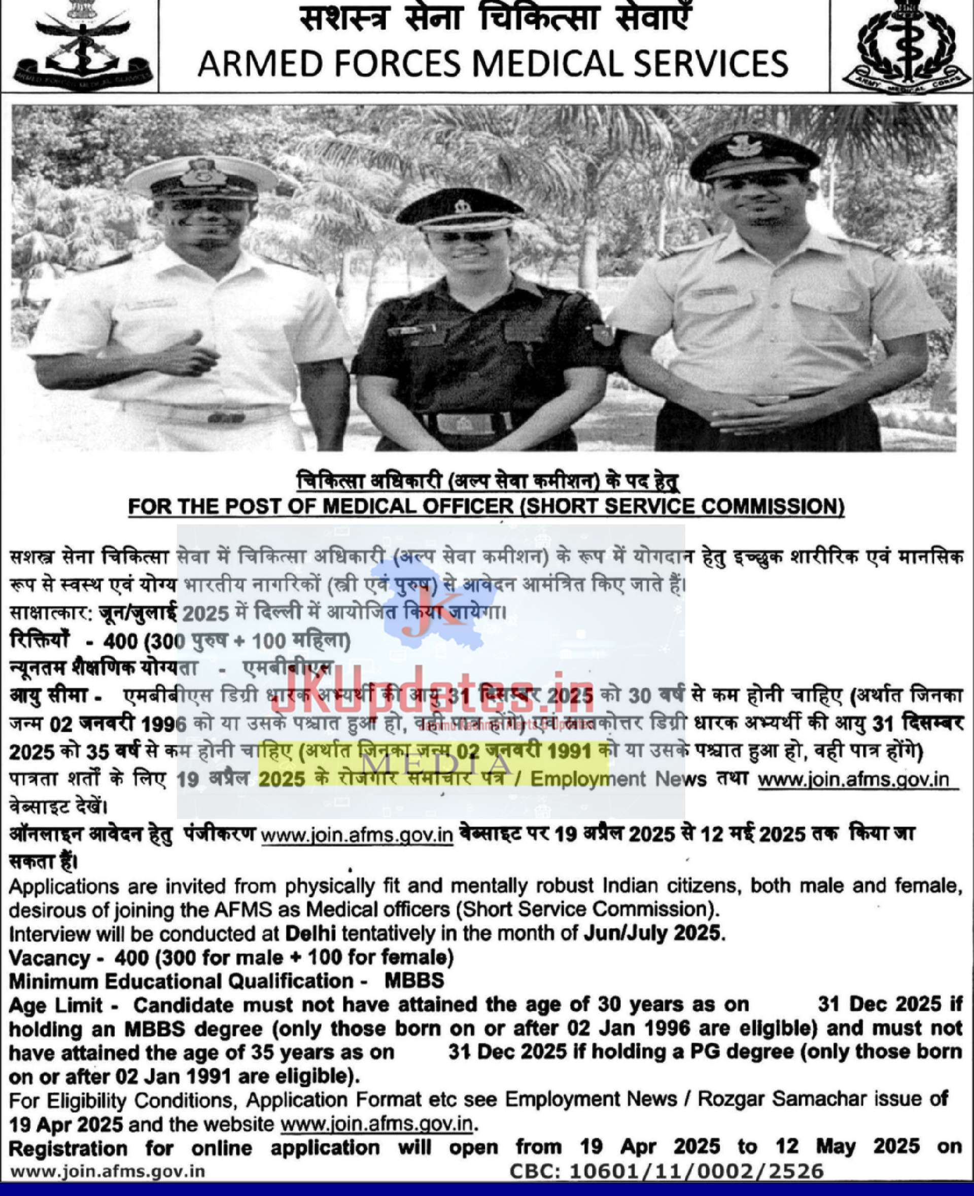 400 Posts: Recruitment in Armed Force Medical Services AFMS