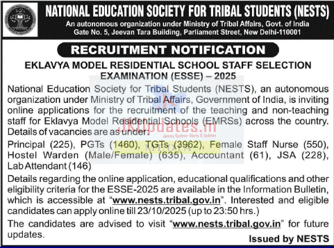 National Education Society for Tribal Students (NESTS), an autonomous organization under Ministry of Tribal Affairs, Government of India, is inviting online applications for the recruitment of the teaching and non-teaching staff for Eklavya Model Residential Schools (EMRSs) across the country.
