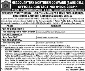 Local Selection Board (LSB) interview for the academic session 2026–27 will be conducted on a term basis for Non-Teaching Staff and Administrative Core Staff for the following Army Public Schools.