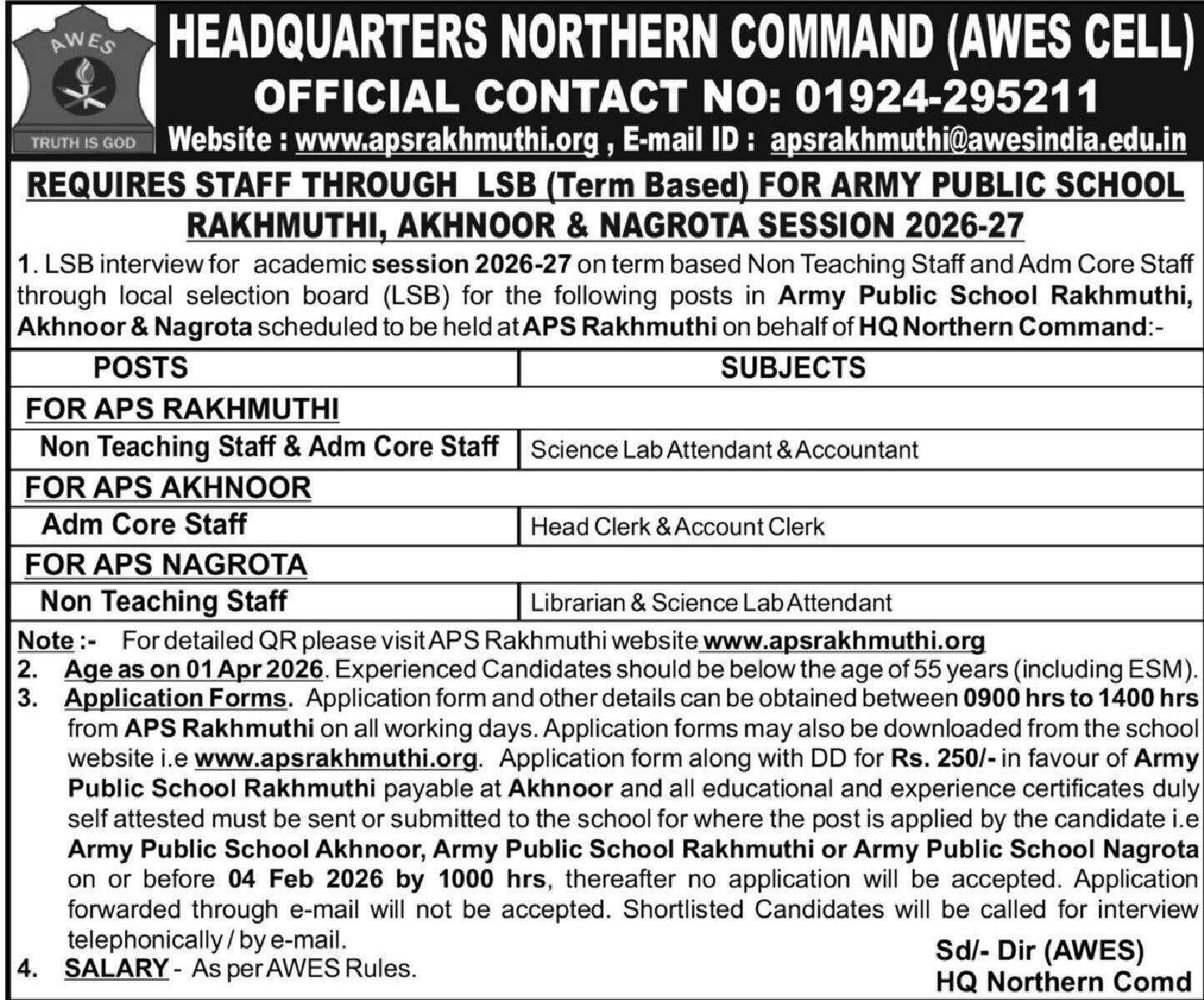 APS Rakhmuthi, Akhnoor & Nagrota Recruitment for Session 2026–27