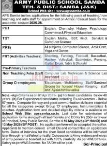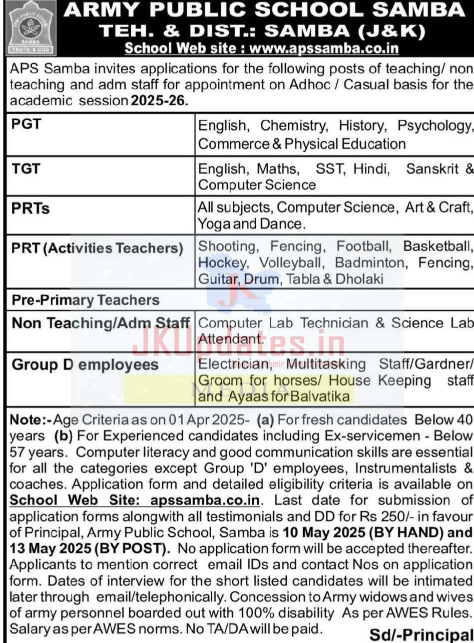 APS Samba Jobs invites applications for the following posts of teaching/ non-teaching and adm staff for appointment on Adhoc / Casual basis for the academic session 2025-26.