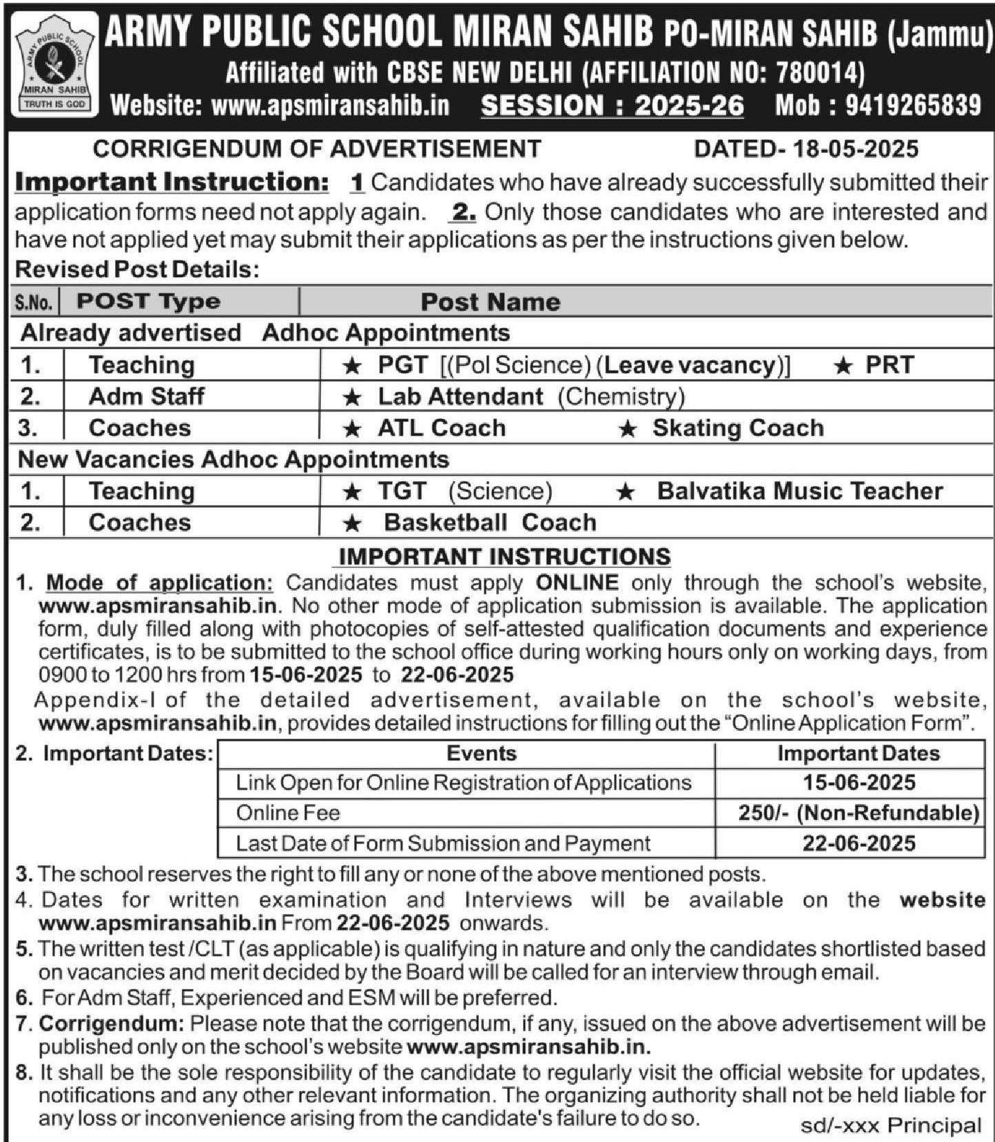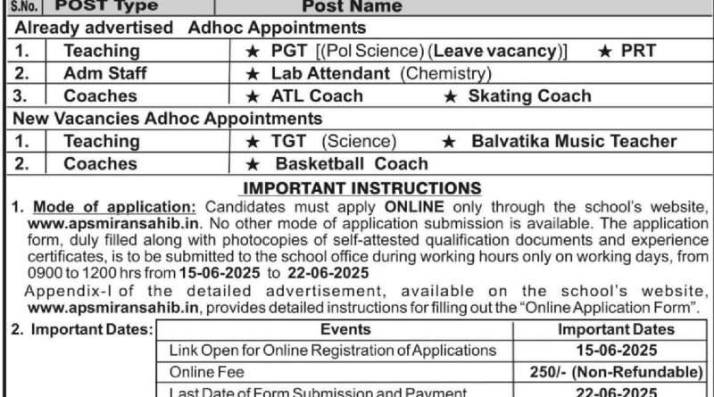 Appendix-I of the detailed advertisement, available on the school’s website, www.apsmiransahib.in, provides detailed instructions for filling out the “Online Application Form