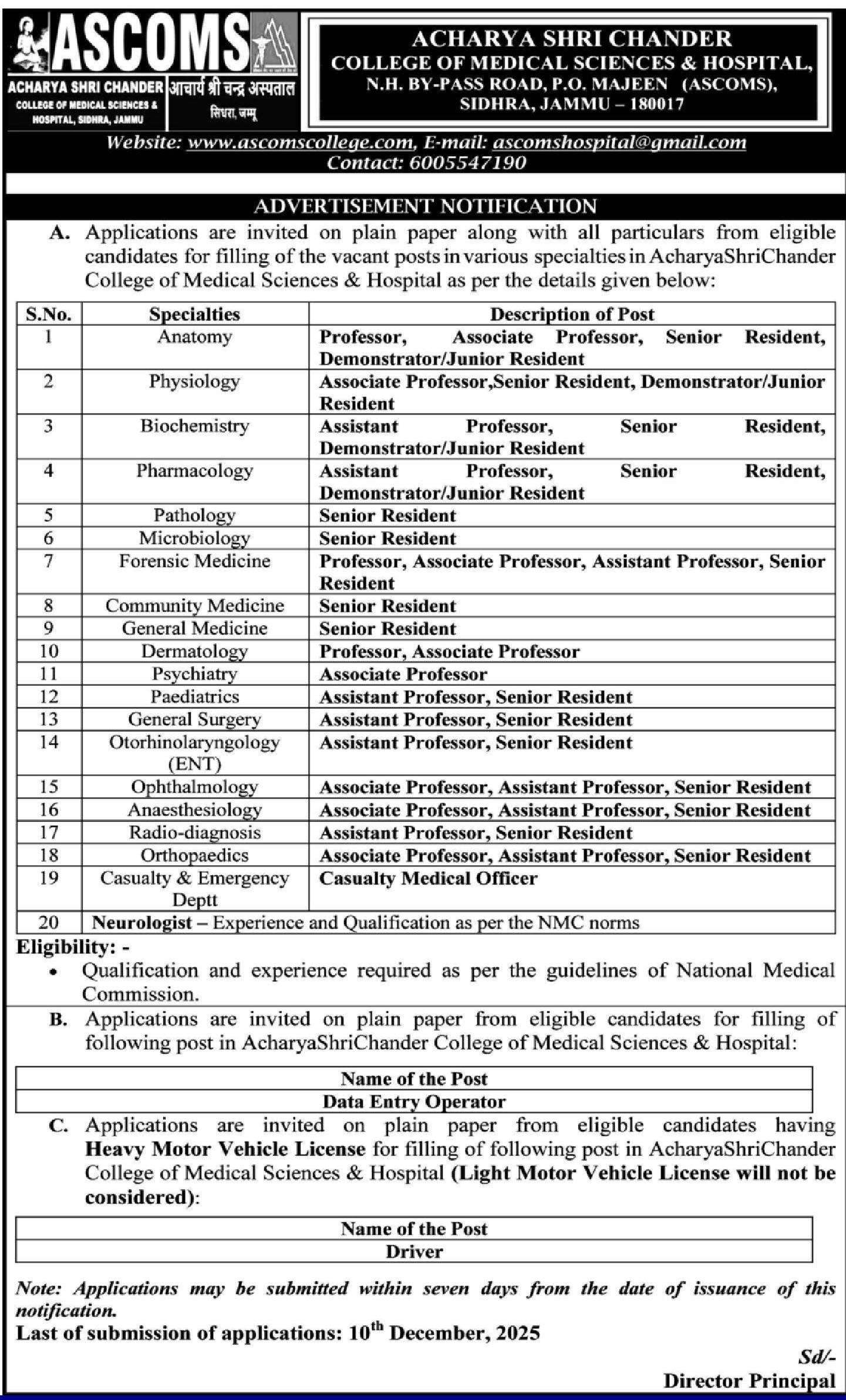 Applications are invited on plain paper along with all particulars from eligible candidates for vacant posts in various specialties in Acharya Shri Chander College of Medical Sciences & Hospital.