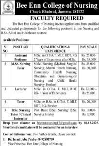 The Bee Enn College of Nursing invites applications from qualified and dedicated professionals for the following positions in our Nursing and B.Sc. Allied and Healthcare courses.