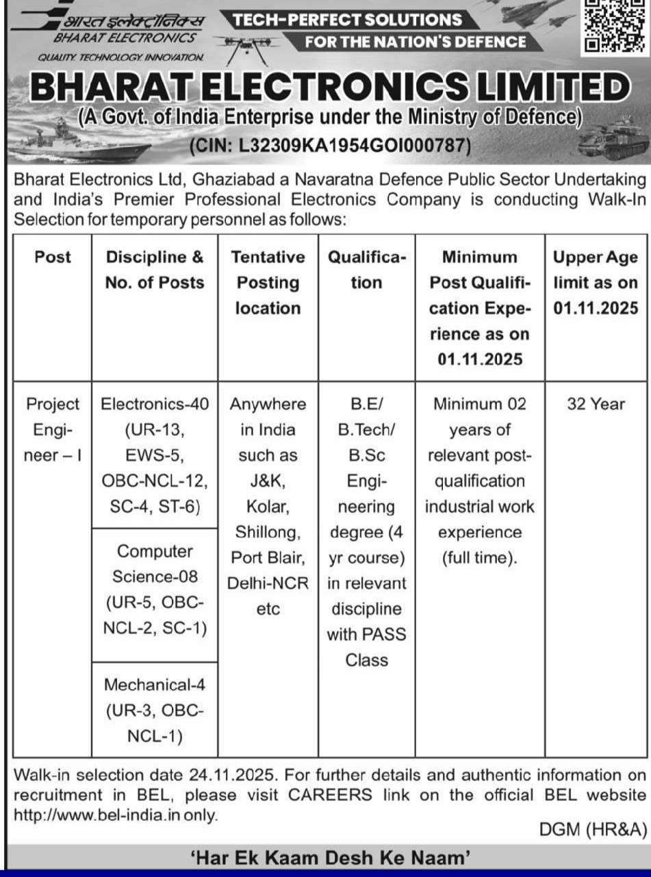 BEL, Ghaziabad, a Navaratna Defence Public Sector Undertaking and India’s premier professional electronics company, is conducting a walk-in selection for temporary personnel as follows: