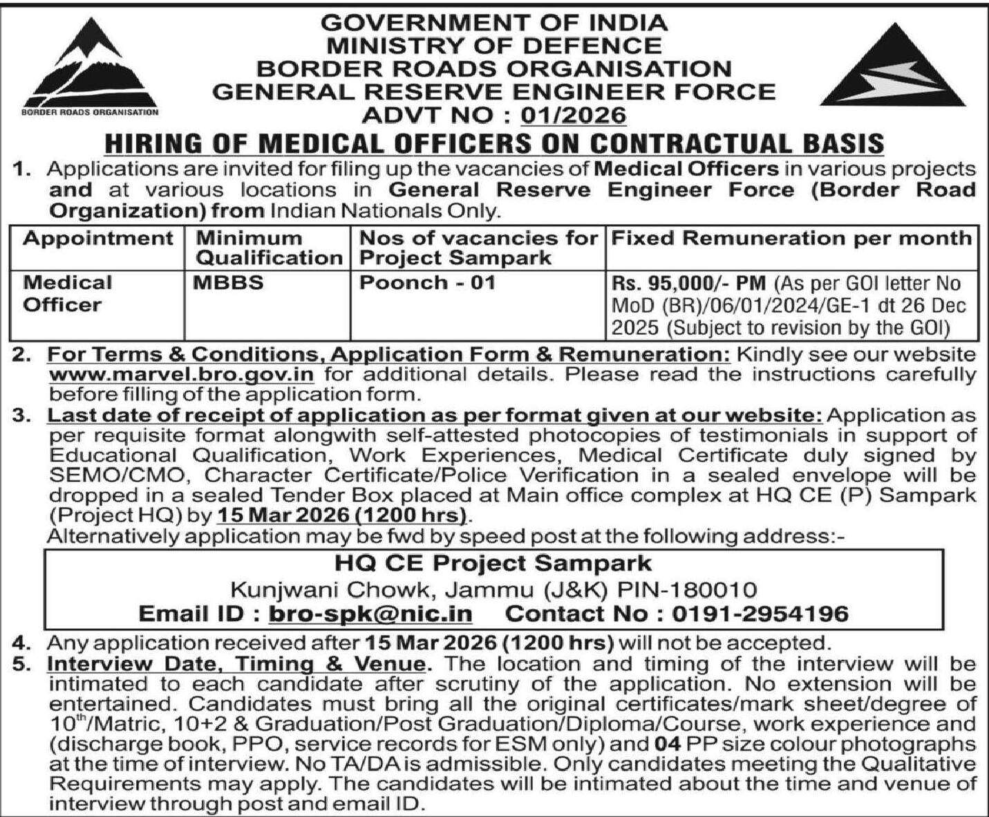 Applications are invited for filling up the vacancies of Medical Officers in various projects and at various locations in General Reserve Engineer Force (Border Road Organization) from Indian Nationals Only.