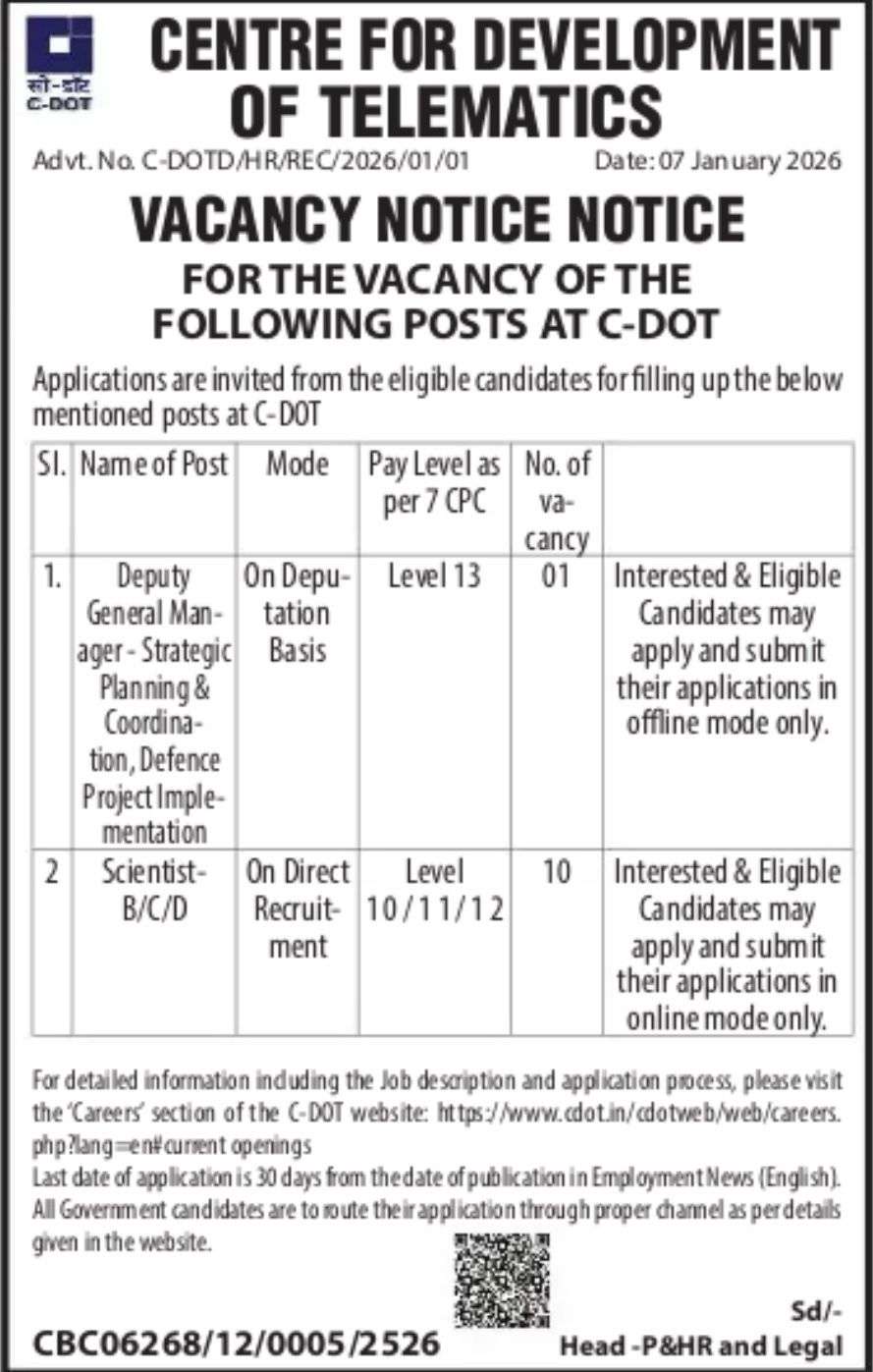 For detailed information including job description and application process, please visit the Careers section of the C-DOT website: