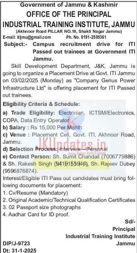 Skill Development Department, J&K, Jammu is going to organize a Placement Drive at Govt. ITI Jammu on 03/02/2025 (Monday) as “Company Genus Power Infrastructure Ltd” is offering placement for ITI Passed out trainees.