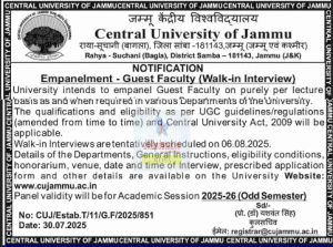 University intends to empanel Guest Faculty on purely per lecture basis as and when required in various Departments of the University.