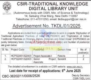 Applications are invited from qualified candidates to work in projects Digitization of Traditional Agricultural Practices of India” (HCP522401) and ‘Digitization of Indian Traditional Practices on Minerals, Metals. Materials and Allied Areas” (HCP522403) on purely temporary basis. Details of Position(s), Domain area(s) and Number of position(s) are given below:
