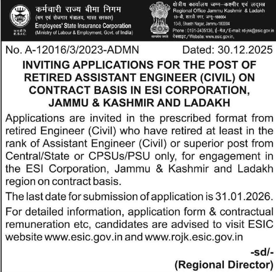 Applications are invited in the prescribed format from retired Engineers (Civil) who have retired at least in the rank of Assistant Engineer (Civil) or a superior post from Central/State Government or CPSUs/PSUs only, for engagement in the ESI Corporation, Jammu & Kashmir and Ladakh region on contract basis.