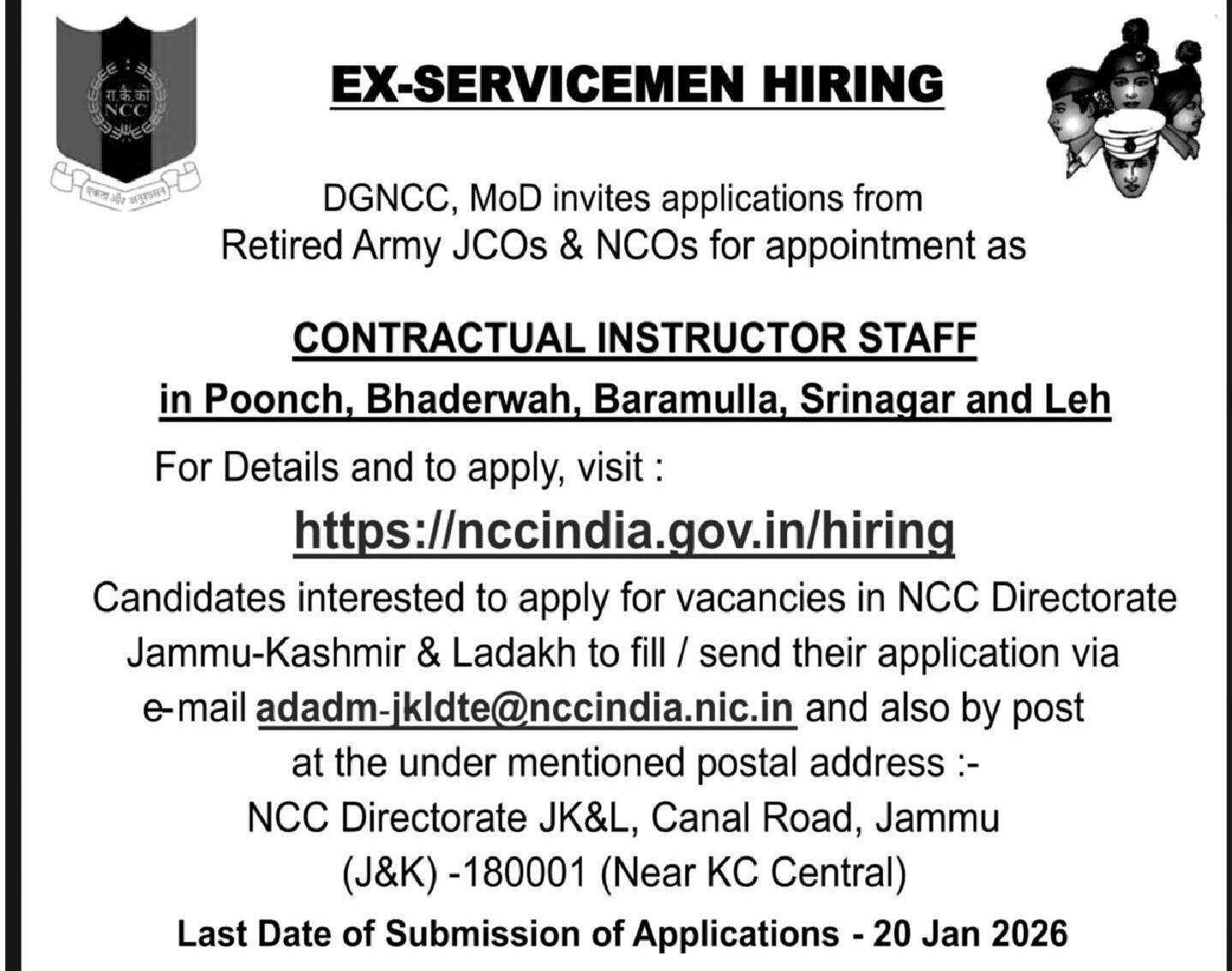 Candidates interested to apply for vacancies in NCC Directorate Jammu-Kashmir & Ladakh to fill/send their application via e-mail [email protected] and also by post at the under mentioned postal address: