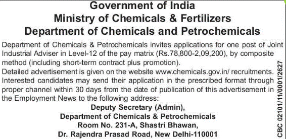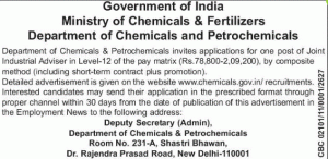 The Department of Chemicals & Petrochemicals, under the Ministry of Chemicals & Fertilizers, Government of India, has invited applications for one (01) post of Joint Industrial Adviser.