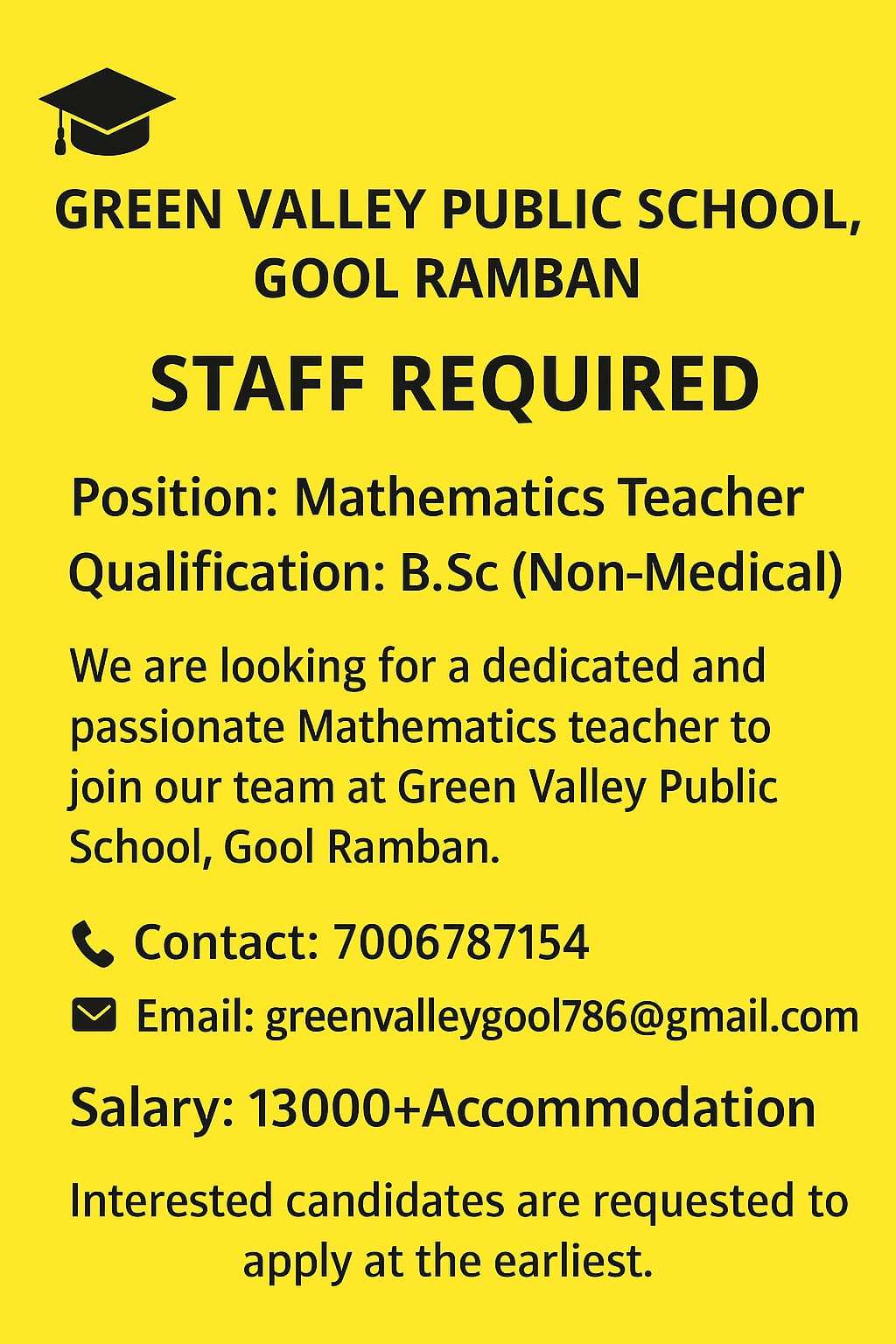 We are looking for a dedicated and passionate Mathematics teacher to join our team at Green Valley Public School, Gool Ramban.