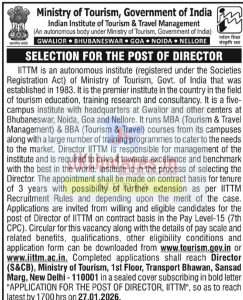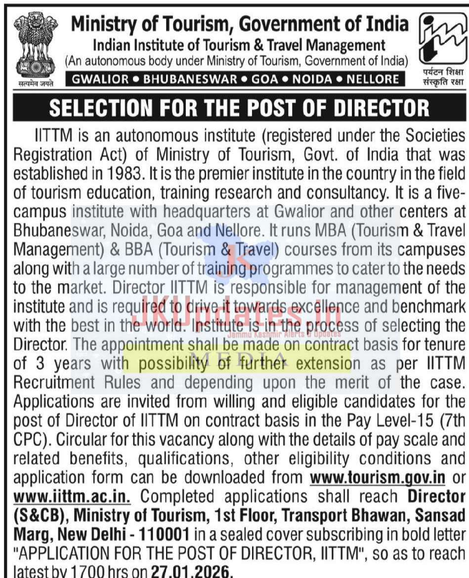 The Ministry of Tourism, Government of India, has invited applications for the post of Director at the Indian Institute of Tourism and Travel Management (IITTM). IITTM is a premier national institute established in 1983, offering MBA and BBA programs in Tourism and Travel Management and operating from five campuses across India.
