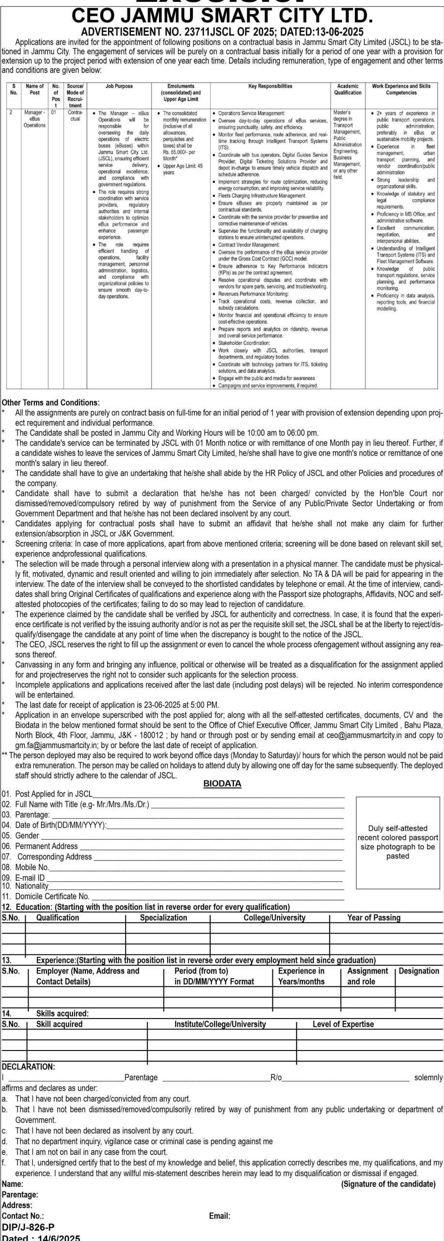 Biodata in the below mentioned format should be sent to the Office of Chief Executive Officer, Jammu Smart City Limited , Bahu Plaza