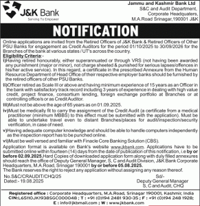 Online applications are invited from the Retired Officers of J&K Bank & Retired Officers of Other PSU Banks for engagement as Credit Auditors for the period 01/10/2025 to 30/09/2026 for the Branches of the bank at various states/UT’s across the country.