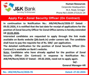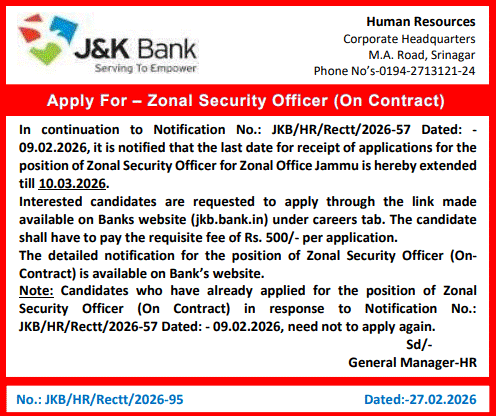 In continuation to Notification No.: JKB/HR/Rectt/2026-57 Dated: -09.02.2026, it is notified that the last date for receipt of applications for the position of Zonal Security Officer for Zonal Office Jammu is hereby extended till 10.03.2026.