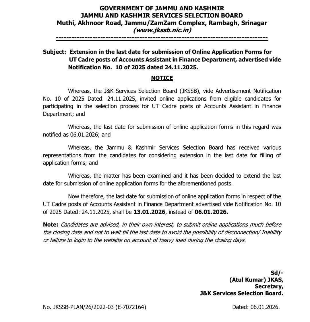 JKSSB Finance Account Assistant Recruitment – Last Date Extended