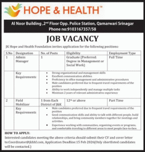 JK Hope & Health Foundation Announces Job Vacancies in J&K