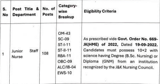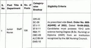 In pursuance of Government Order No. 307-JK(HME) of 2022 dated 18-05-2022 regarding the creation of posts for the establishment of Government Medical College, Handwara, and in terms of S.O. 364 of 2020 dated 27-11-2020, online applications are invited from eligible candidates for engagement against Non-Gazetted (Technical) posts of Junior Staff Nurse on an Academic Arrangement Basis.