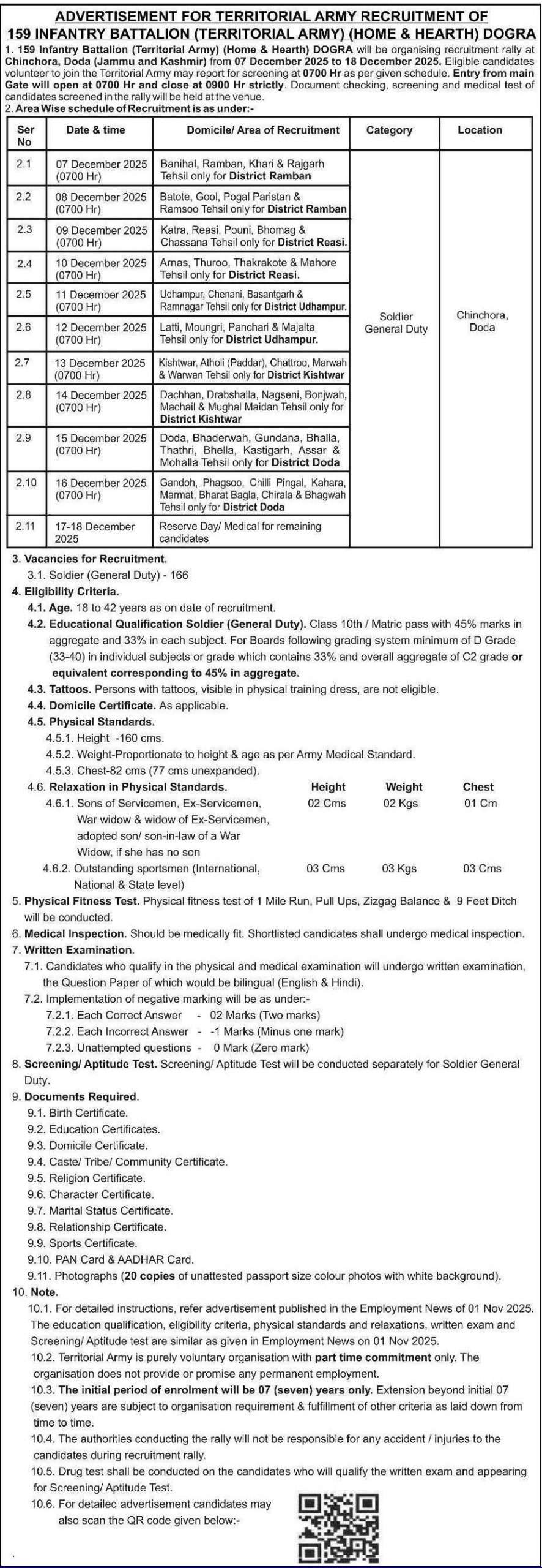159 Infantry Battalion (Territorial Army) (Home & Hearth) DOGRA will be organising recruitment rally at Chinchora, Doda (Jammu and Kashmir) from 07 December 2025 to 18 December 2025.