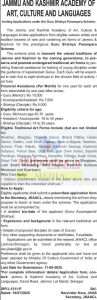 *For complete information/ details/ Application form, contact: Jammu & Kashmir Academy of Art, Culture and Languages, Canal Road, Jammu/ Lal Mandi, Srinagar.