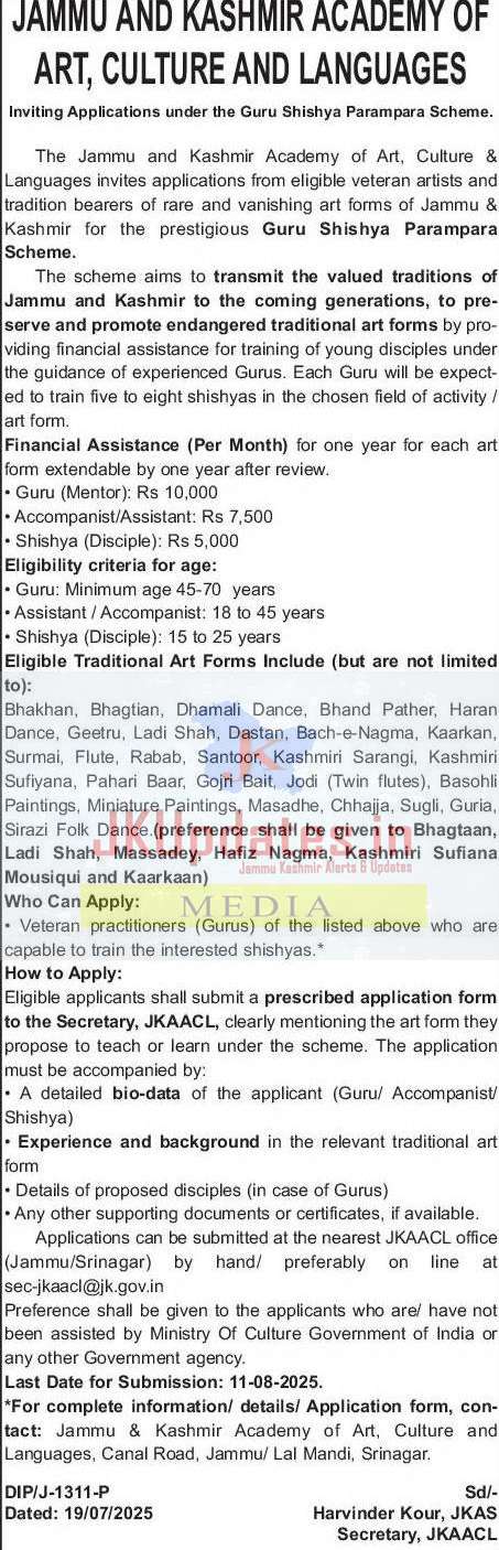 The Jammu and Kashmir Academy of Art, Culture & Languages invites applications from eligible veteran artists and tradition bearers of rare and vanishing art forms of Jammu & Kashmir for the prestigious Guru Shishya Parampara Scheme.