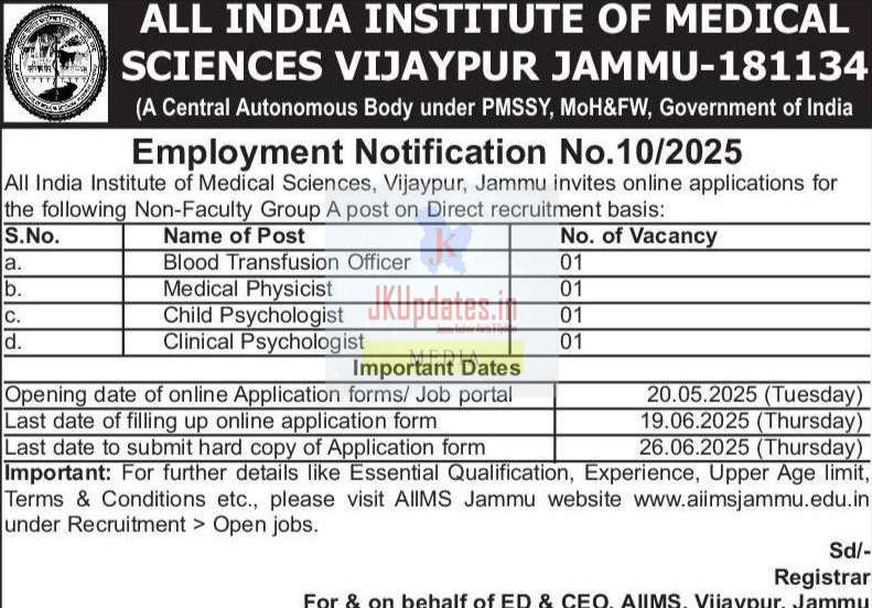 Important: For further details like Essential Qualification, Experience, Upper Age limit, Terms & Conditions etc., please visit AllMS Jammu website www.aiimsjammu.edu.in under Recruitment > Open jobs.