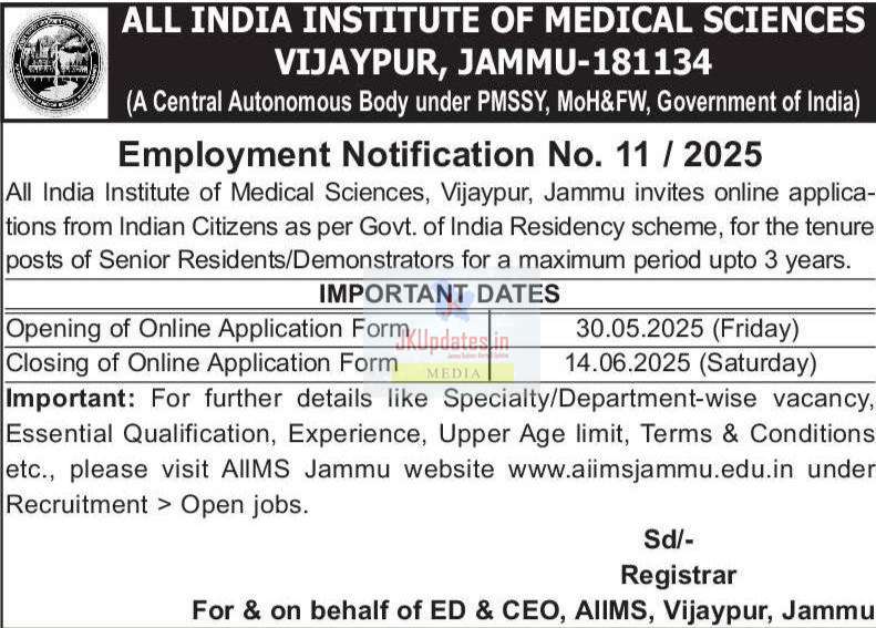 All India Institute of Medical Sciences, Vijaypur, Jammu invites online applications from Indian Citizens as per Govt. of India Residency scheme, for the tenure posts of Senior Residents/Demonstrators for a maximum period upto 3 years.