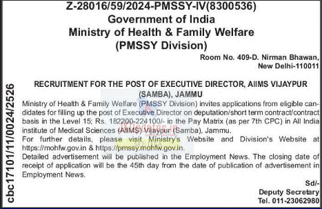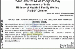 Ministry of Health & Family Welfare (PMSSY Division) invites applications from eligible candidates for filling up the post of Executive Director on deputation/short term contract/contract basis in the Level 15; Rs. 182200-224100/- in the Pay Matrix (as per 7th CPC) in All India institute of Medical Sciences (AIIMS) Vijaypur (Samba), Jammu.