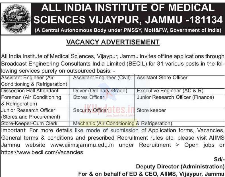 All India Institute of Medical Sciences, Vijaypur, Jammu invites offline applications through Broadcast Engineering Consultants India Limited (BECIL) for 31 various posts in the following services purely on outsourced basis: –