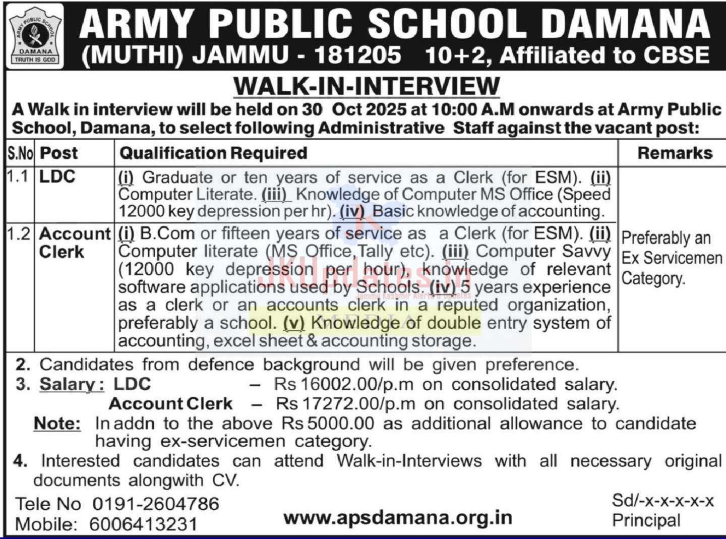 A walk-in interview will be held on 30th October 2025 at 10:00 A.M onwards at Army Public School, Damana, to select the following administrative staff against the vacant posts: