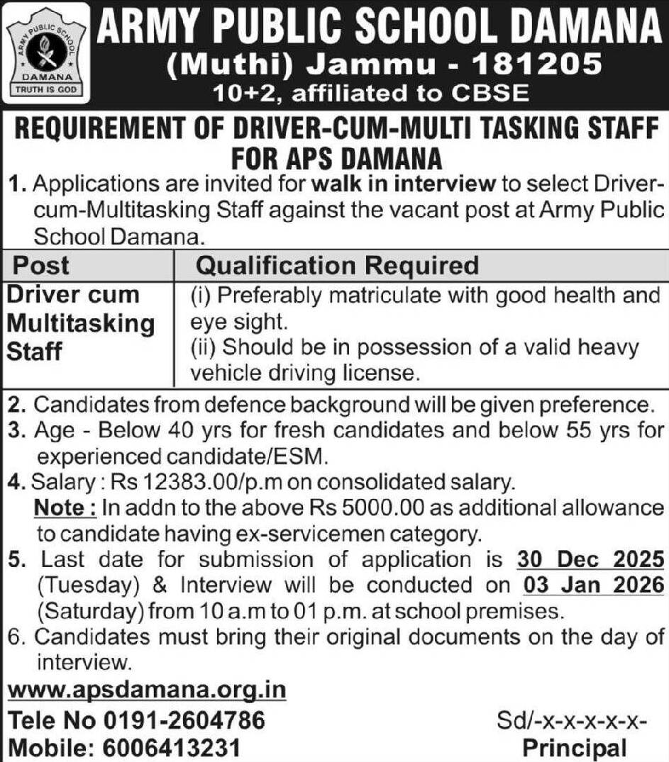 Applications are invited for walk-in interview to select Driver-cum-Multitasking Staff against the vacant post at Army Public School Damana.
