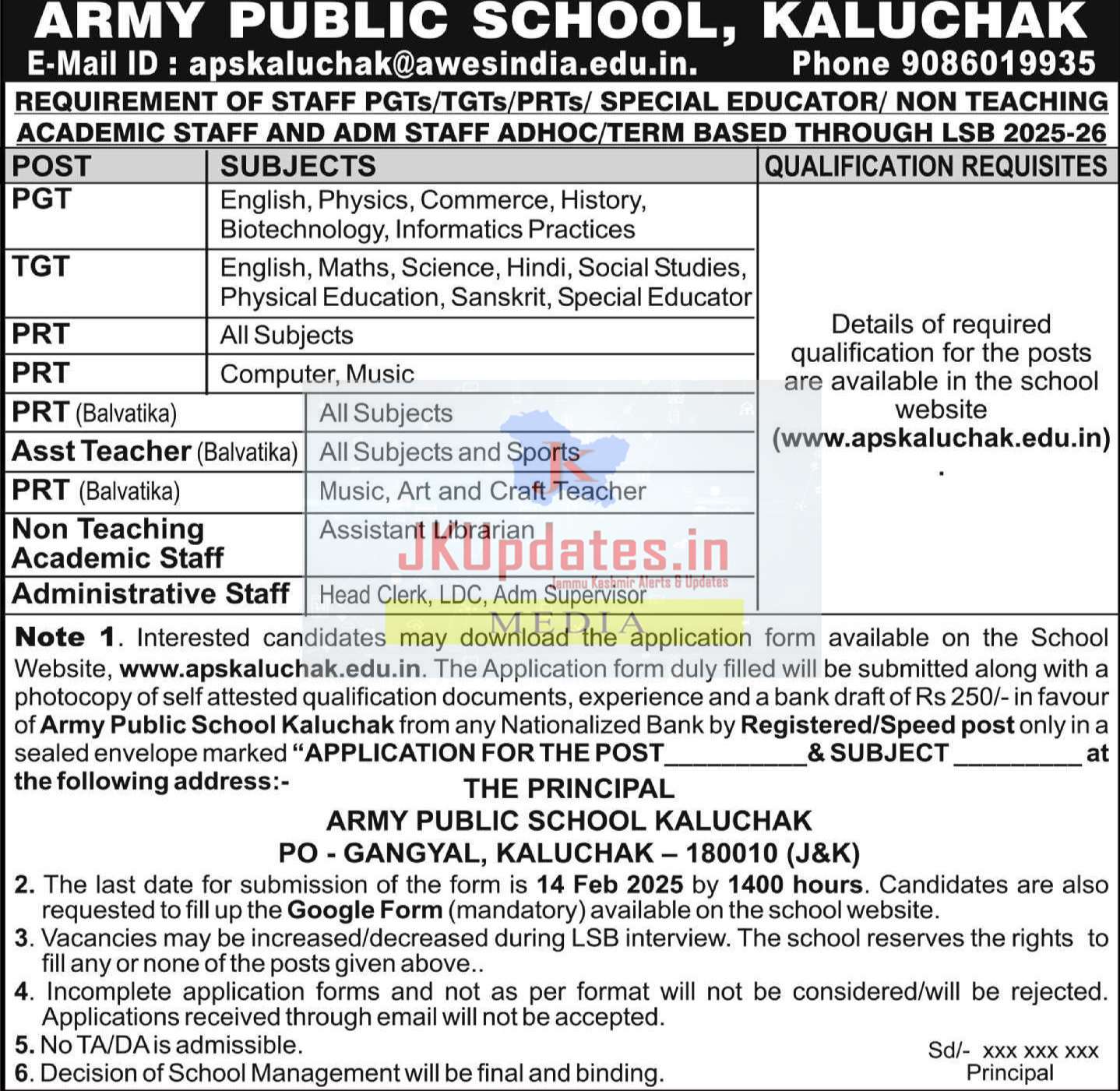 1. Interested candidates may download the application form available on the School Website, www.apskaluchak.edu.in. The Application form duly filled will be submitted along with a photocopy of self attested qualification documents, experience and a bank draft of Rs 250/- in favour of Army Public School Kaluchak from any Nationalized Bank by Registered/Speed post only in a sealed envelope marked “APPLICATION FOR THE POST & SUBJECT at the following address:- THE PRINCIPAL ARMY PUBLIC SCHOOL KALUCHAK PO – GANGYAL, KALUCHAK — 180010 (J&K)