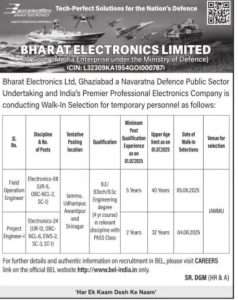 Bharat Electronics Ltd, Ghaziabad a Navaratna Defence Public Sector Undertaking and India’s Premier Professional Electronics Company is conducting Walk-In Selection for temporary personnel as follows: