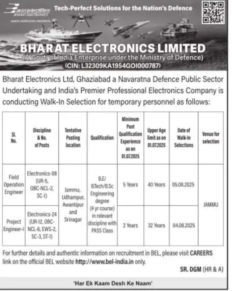 Job Recruitment in Bharat Electronics Ltd BEL, J&K