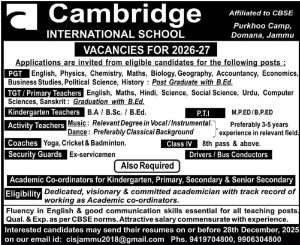 Academic Co-ordinators for Kindergarten, Primary, Secondary & Senior Secondary