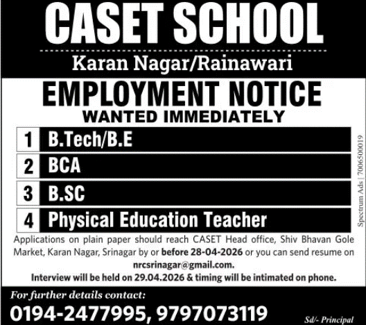 Interested candidates should submit their applications on plain paper at the CASSET Head Office, Shiv Bhawan, Gole Market, Karan Nagar, Srinagar, on or before 28 April 2026.