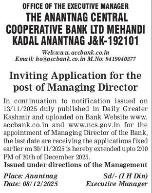 In continuation to notification issued on 13/11/2025 duly published in Daily Greater Kashmir and uploaded on Bank Website www.accbank.co.in and www.ncs.gov.in for the appointment of Managing Director of the Bank, the last date for receiving the applications fixed earlier on 30/11/2025 is hereby extended upto 2:00 PM of 20th of December 2025.