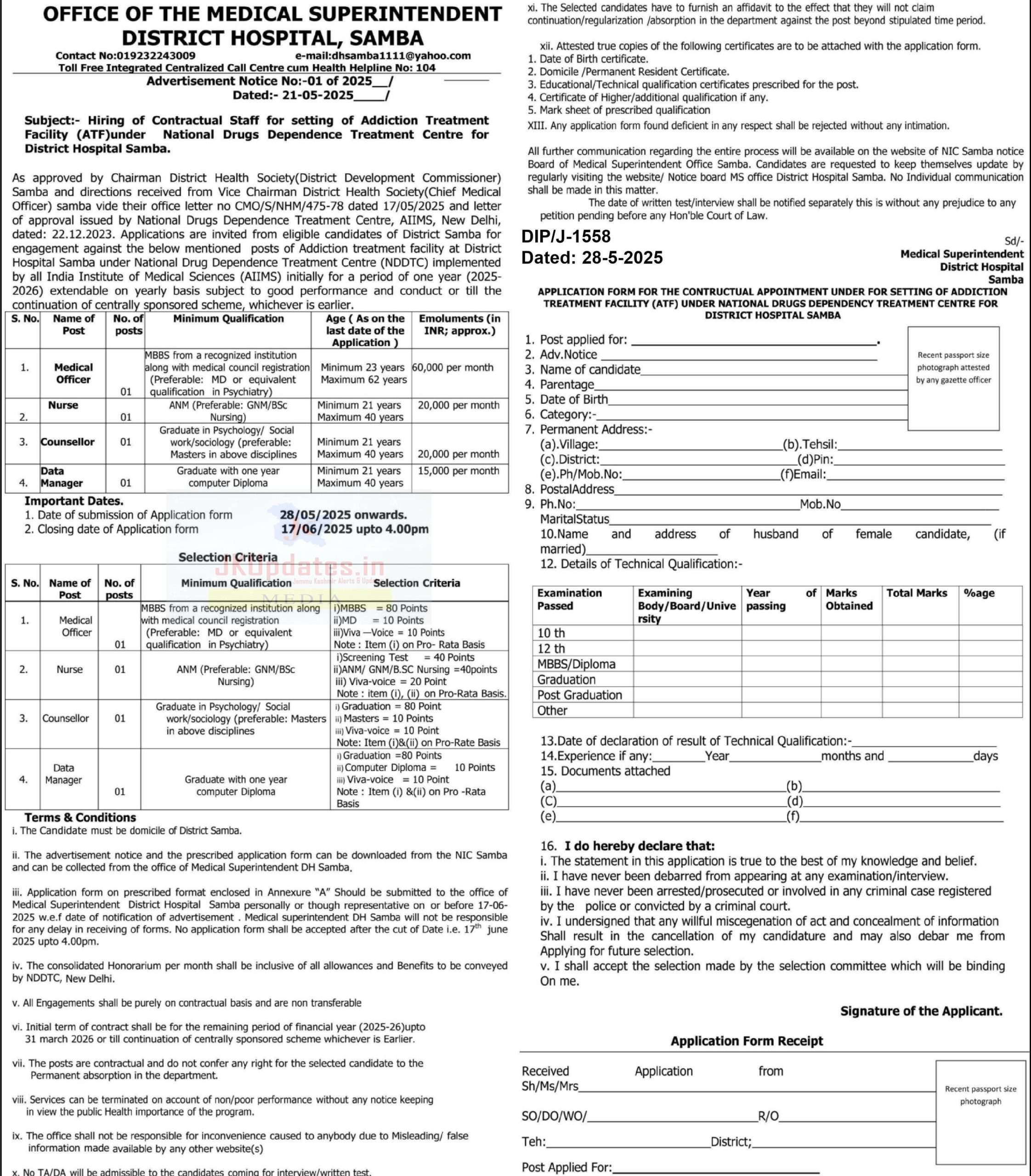 III. Application form on prescribed format enclosed in Annexure “A” Should be submitted to the office of Medical Superintendent District Hospital Samba personally or though representative on or before 17-06-2025 w.e.f date of notification of advertisement . Medical superintendent DH Santa will not be responsible for any delay in receiving of forms. No application form shall be accepted after the cut of Date i.e. 17th June 2025 upto 4.00pm.